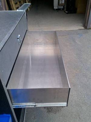 Fully equipped mobile unit with lid mounted 42” TV monitor, aluminum drawers on guides, pull up power source with USB ports, large work surface, removable work table, pull out printer shelf, storage area, supply drawer and gas filled lid struts. Safe, secure and non-porous for all your radios, laptops, printers, phones and other electrical equipment!